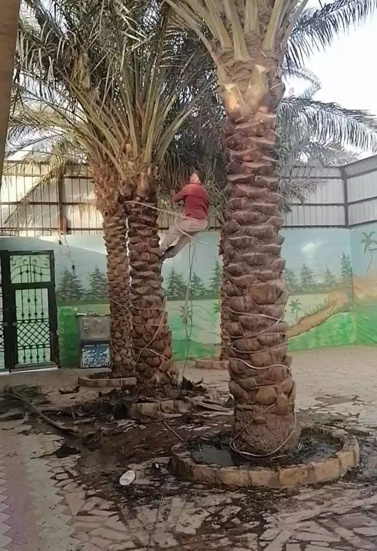 عامل تكريب نخل بالرياض يقوم بأعمال مهمة تتعلق بزراعة النخيل والعناية به.